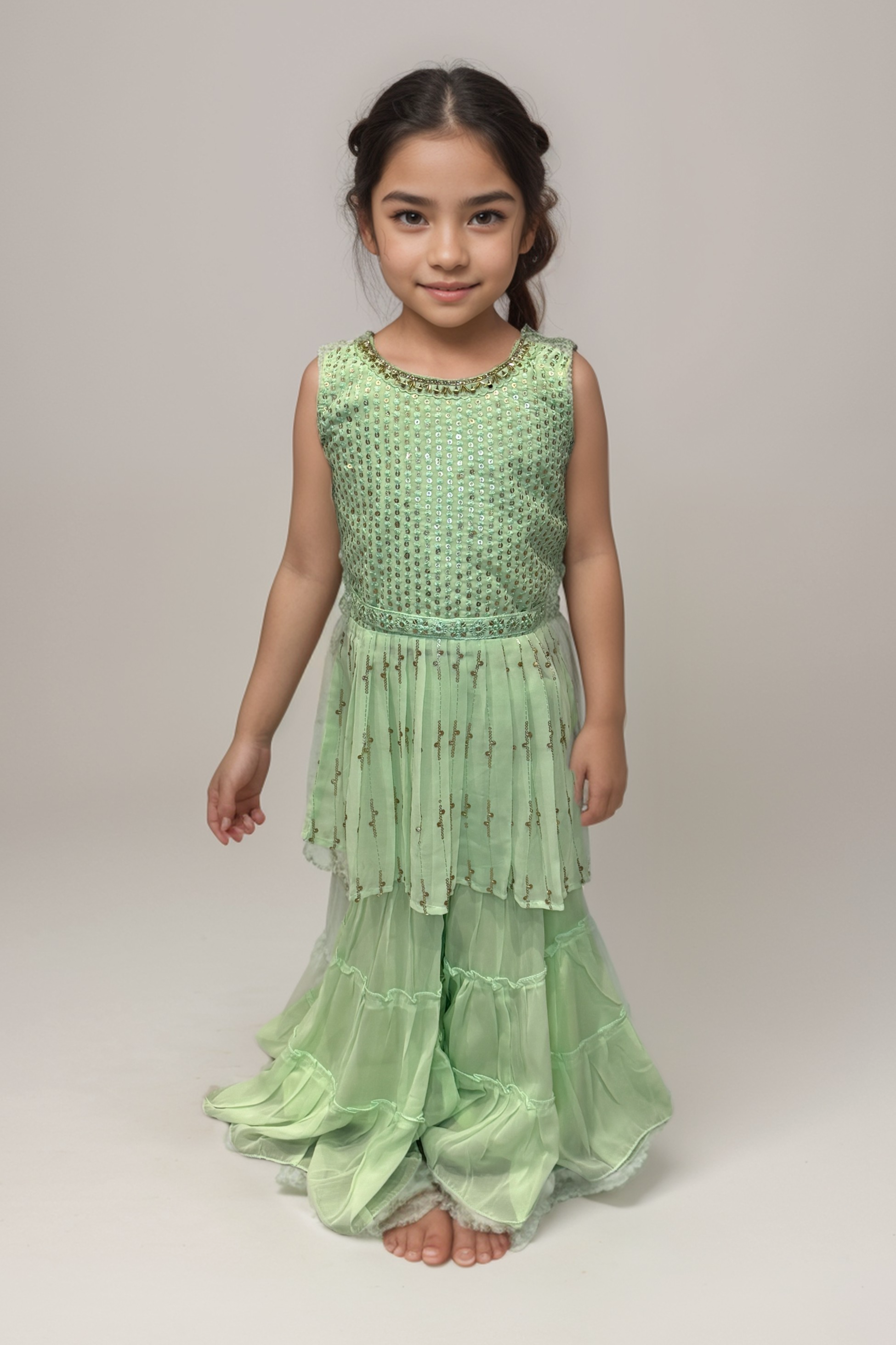 Introducing our charming Light Green Gharara for children, adorned with shimmering sequins and a chic belt. Perfect for special occasions, this delightful ensemble combines style and comfort effortlessly, ensuring your little one shines with every step. Dupatta included.