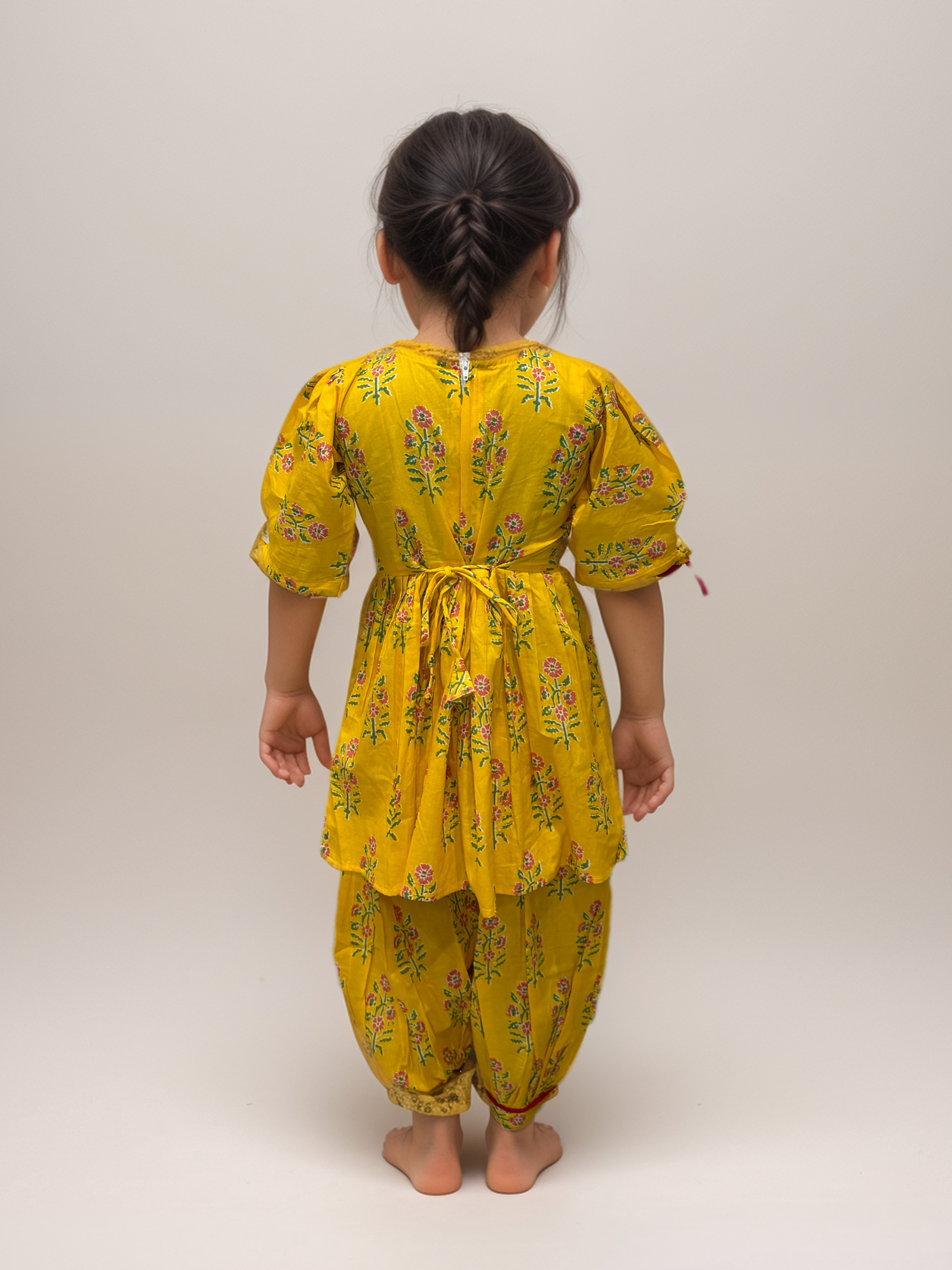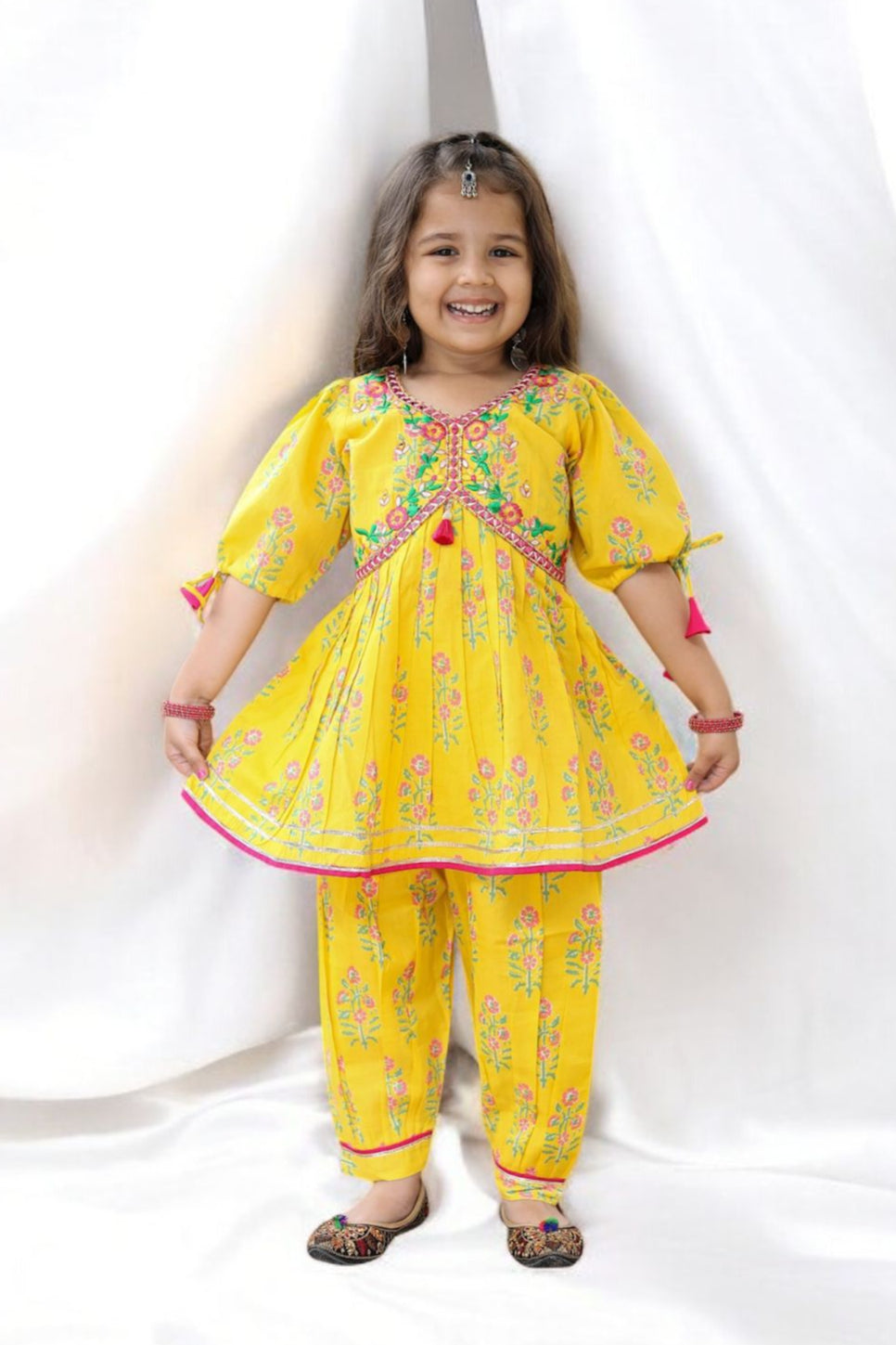 This stunning yellow harem pant suit is the perfect blend of traditional charm and modern comfort. The outfit features a bright yellow fabric adorned with intricate mirror work, adding a touch of sparkle and elegance. Ideal for festive occasions or casual wear, this ensemble radiates joy and vibrancy, making it a must-have in any wardrobe.